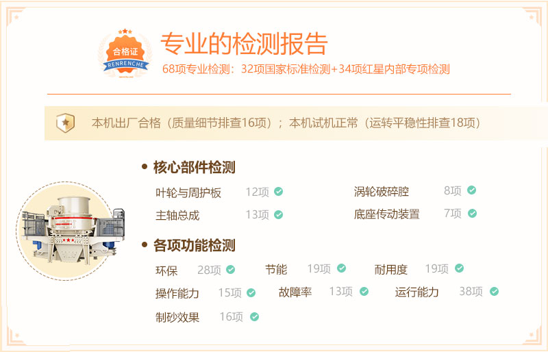 檢驗結(jié)果:經(jīng)專業(yè)檢測,該設(shè)備無論是核心部件還是各項功能均達(dá)標(biāo),并表現(xiàn)非常良好,核心零部件結(jié)實耐用、壽命長;日常操作靈活便捷、故障少,且具有效能高、高產(chǎn)、節(jié)能、環(huán)保、成品效果好等諸多亮點(diǎn)。設(shè)備綜合情況非常不錯,符合現(xiàn)代化石料廠需求設(shè)備標(biāo)準(zhǔn)。詳細(xì)的報告細(xì)節(jié)如下: